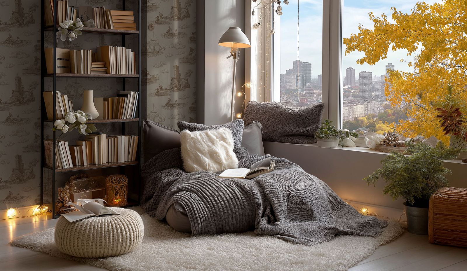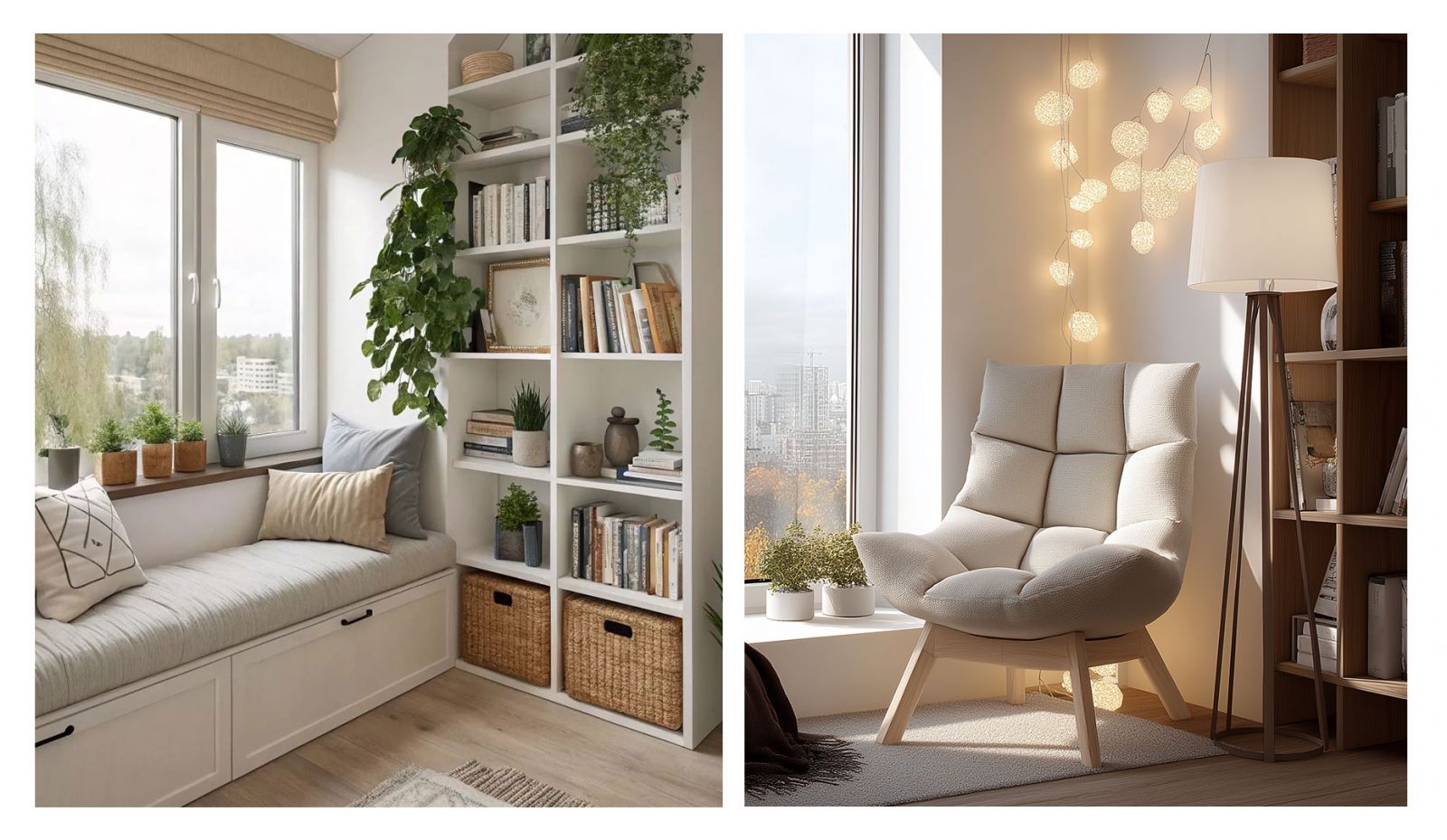 Если подоконник широкий, можно разместить на нем небольшие полки или стеллажи для любимых произведений. Если места мало, используйте настенные полки, расположенные над зоной отдыха. Идеально подойдет настольная лампа с регулируемым направлением света, чтобы вы могли читать, не напрягая глаза. Можно также использовать гирлянды с теплым светом для создания особой, волшебной атмосферы.