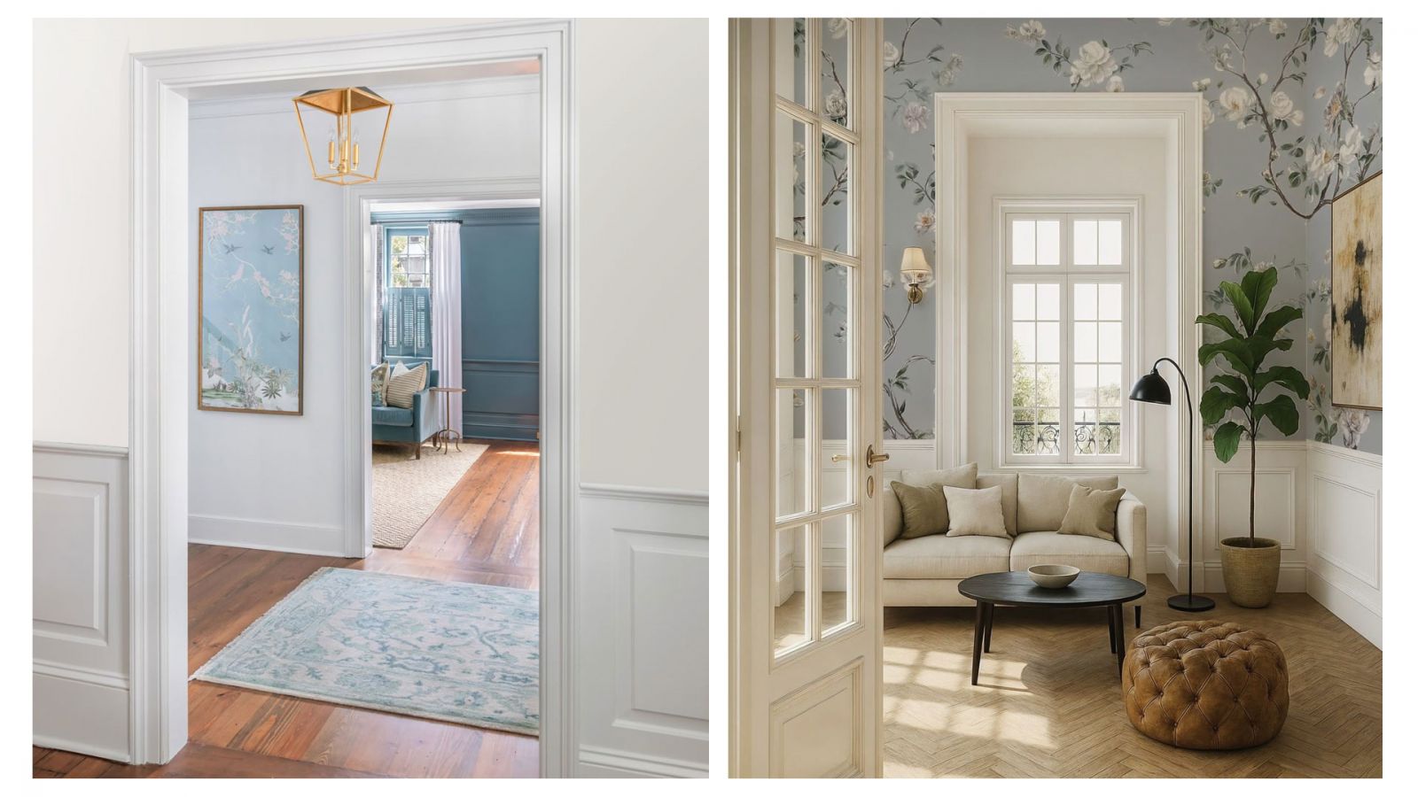 В то время, когда современные интерьеры отдают предпочтение открытым совмещенным пространствам и свободным планировкам, французский стиль остаётся верен камерности и уединённости. Даже если квартира не располагает большим количеством квадратных метров, в ней обязательно будут возведены стены, перегородки. Соответственно, нужно много света, чтобы наполнить помещение визуальным объёмом. Отсюда и выбор в пользу светлой цветовой гаммы в белых тонах. Стены как правило красят в белые, молочные оттенки, наносят венецианскую штукатурку. Но также имеют место быть и обои в стиле прованс. Чаще всего это простые геометрические узоры или флористические мотивы. Элегантные изящные линии, наивные цветочные орнаменты, сдержанная цветовая гамма – всё это настоящий маст-хэв для тех, кто стремится превратить своё пространство в частичку утончённого современного Парижа.