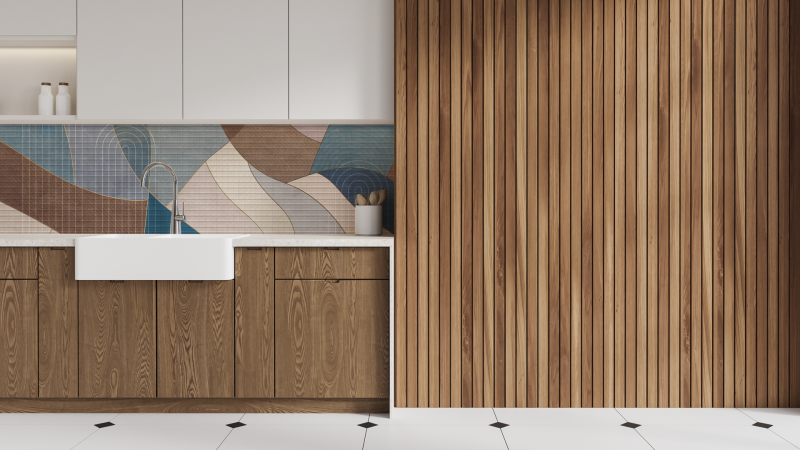 Однако помимо правильного расположения, немаловажна и практичность кухни в целом. Это проявляется в удобстве хранения, лёгкости уборки и эстетике пространства. Например, фартук с мозаикой не только украсит интерьер, но и защитит стены от брызг и загрязнений. При этом поверхность мозаики легко очищается мягкой губкой и мыльным раствором.